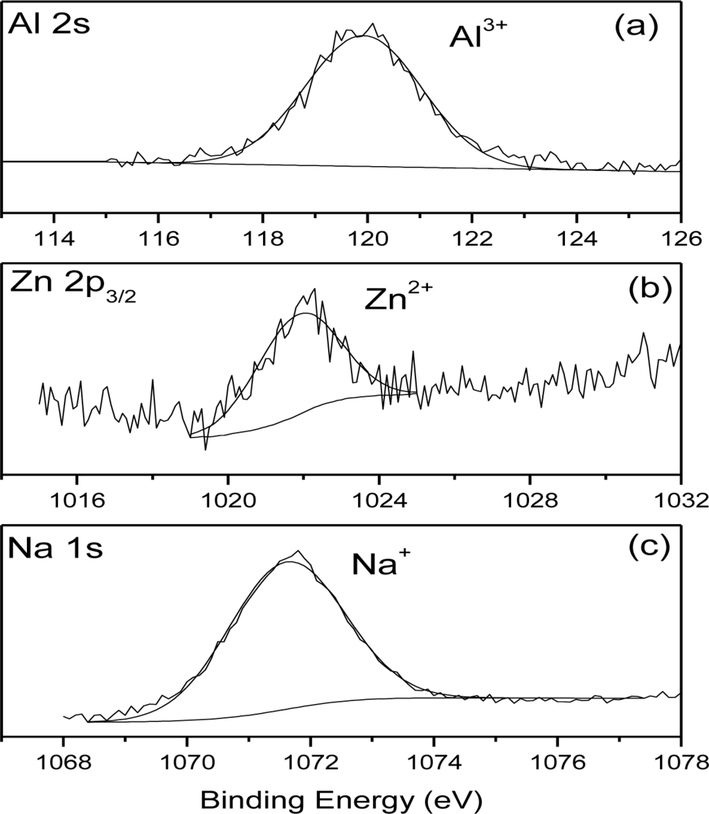 Figure 6 shows the Al2s (a), Zn 2p3/2 (b) and Na 1s (c) XPS high resolution spectra obtained on the surface of the AZ31-P substrate after 10 min of treatment. These spectra are representative of the similar Al 2s, Zn 2p3/2 and Na1s spectra obtained on the surface of the AZ31-P and AZ61-P substrates after other treatment times. In the Al 2 s spectrum (Figure 6a) there is a component at 120.0 eV characteristic of aluminum in ionic state (Al3+ type). The Zn2p3/2 high resolution spectrum (Figure 6b) may be fitted to one component with a binding energy of 1022.0 eV associated with the presence of Zn2+. Finally, the Na1s spectrum (Figure 6c) may be fitted to one component at 1071.7 eV associated with the presence of sodium ions (Na+).