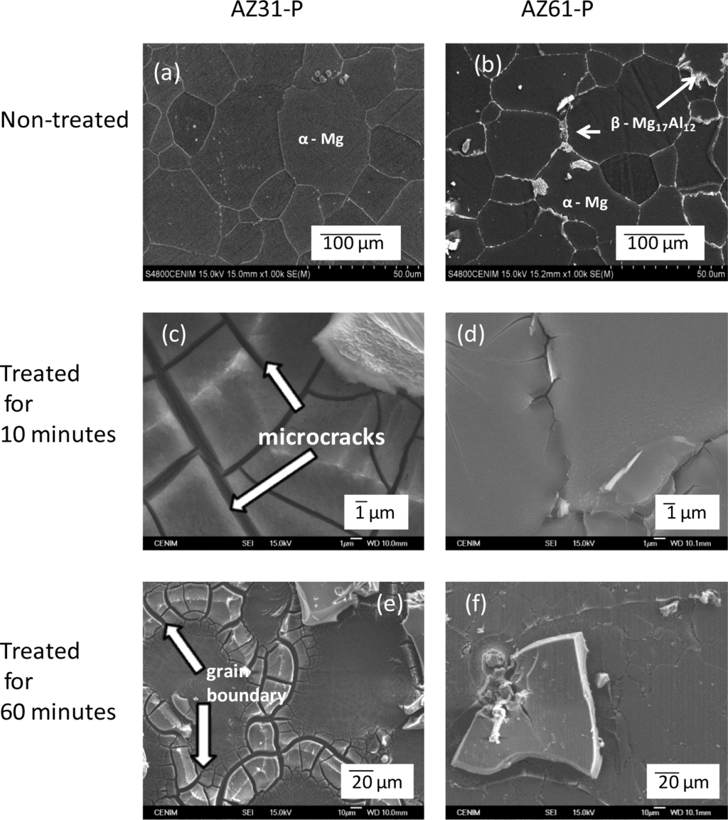 Figure 7 compares the surface microstructures for the non-treated AZ31-P and AZ61-P substrates and treated in NaHCO3 saturated solution for 10 and 60 min. It is important to note that, from the early stages of the treatment, micro-cracks appear on the conversion coating formed on the AZ31-P substrate (Figure 7c). In Figure 7e, which represents the visual appearance of the surface of the AZ31-P substrate treated for 60 min, one can see that the layer is not uniform, and that there are areas without apparent cracks coexistent with other areas with visible cracks, particularly located at grain boundaries (as marked by arrowheads in Figure 7e). The growth of porous, non-uniform coatings with cracks and particularly poor coverage at the grain boundaries during chemical conversion treatment of aluminum alloys has been reported by Lunder et al. [31] and would appear to be a result of the galvanic coupling between the grain boundary/matrix when the grain boundaries apparently became preferred anodic sites and the matrix acts as a cathode. In the present work, this effect seems to be reflected in the visual appearance of the surface of the AZ31-P alloy treated for 60 min (Figure 7e). The microstructure of the non-treated AZ31 alloy is formed practically by an α matrix with Al in solid solution surrounded by grain boundary free of precipitates of β phase (Figure 7a). In the treatment solution, the grain boundaries selectively react because they are more active than grain bulk, motivating the growth of a very defective and heterogeneous layer of conversion coating in this alloy.