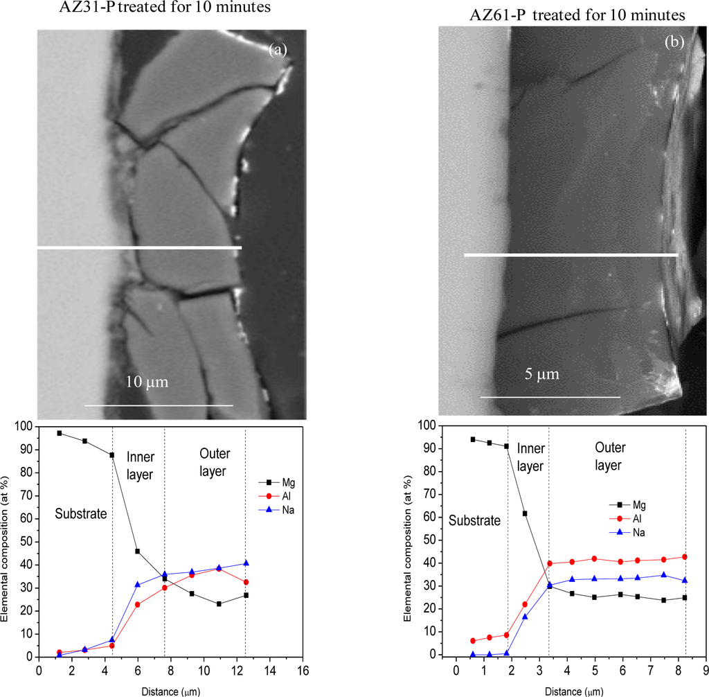 Figure 8 compares SEM images and EDX quantitative analysis for the cross-section of the coating formed on the AZ31-P (a) and AZ61-P substrates (b) treated for 10 min in saturated NaHCO3 solution. Attention is drawn to the presence of significant cracks or discontinuities throughout the thickness of the conversion coating on the AZ31-P substrate (Figure 8a). The conversion coating formed on the AZ61-P substrate (Figure 8b) appears to be much more uniform and compact, and probably protective, than that formed on the AZ31-P substrate. The EDX analysis of the AZ31-P substrate treated for 10 min (Figure 8a) shows how the magnesium, aluminum and sodium contents observed on the outer layers of the conversion coating remain stable. In contrast to the presence of a fairly homogeneous layer noted above, on the inner layers of the conversion coating there is a notable decrease in aluminum and sodium contents and an increase in magnesium content toward the substrate. The composition of the conversion coating formed on the AZ61-P substrate treated for 10 min (Figure 8b) seems to be fairly similar to that formed on the AZ31 alloy (Figure 8a).