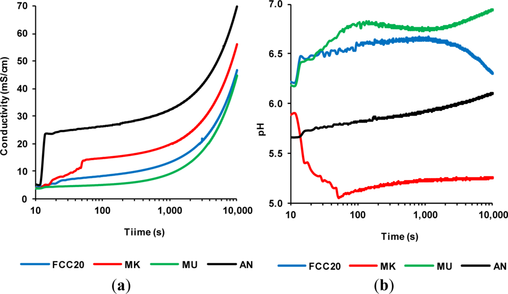 The electrical conductivity and pH of aqueous suspensions of FCC20, MK, MU and AN in the absence of calcium hydroxide were measured. One gram of pozzolan was added to 50 mL of distilled water into a thermostatic vessel at 40 °C. Then, the electrical conductivity and pH measurements were recorded for a total period of 10,000 s.