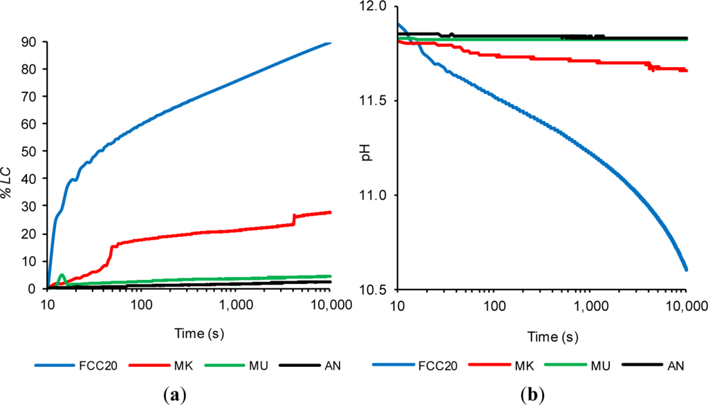 Figure 2a shows plots of the loss of electrical conductivity (%LC)t curves, and Figure 2b presents plots of the pH curves. Regarding the inert materials (MU and AN), it can be observed that the values of (%LC)t are extremely low (the values after 10,000 s are only 4.2% and 2.3%, respectively, as shown in Figure 2a), which indicates negligible pozzolanic activity. This behavior coincides with the observed values of pH variation for the same materials (see Figure 2b), which remain practically constant throughout the trial period. The MU suspension starts with a pH of 11.83 and ends with a value of 11.82 at 10,000 s, while the conductivity of the AN suspension varies from 11.85 to 11.83. The inert behavior of these materials is in significant contrast to the highly reactive behavior of FCC20. In Figure 2a, it can be observed that the (%LC)t for FCC20 reaches high values, namely, 60.0% at 100 s, 75.8% at 1,000 s and 90.0% at 10,000 s. This high loss of electrical conductivity for the FCC20 is related to the high degree of fixation of the Ca2+ and OH− ions. The fixing of OH− ions leads to a large decrease in pH (as can be observed in Figure 2b). The pH values of the FCC20 suspension are 11.90 at time zero, 11.52 at 100 s, 11.22 at 1000 s and, finally, 10.60 at 10,000 s. Finally, in these trials, it can be observed that MK also shows a high degree of pozzolanic activity, although this reactivity is not as large as that recorded for the FCC20 during this study. When comparing these pozzolans, it is remarkable to note that the pozzolanic reaction is immediate for the catalyst, which does not happen for MK; this observation further corroborates the results observed by thermogravimetric analysis [20]. For the MK suspension, a slight amount of initial activity can be observed, which accelerates at approximately 40 s and slows down until 4100 s is reached, at which point, a second acceleration can be observed. For comparative purposes with FCC20, the values of (%LC)t for MK are 17.59% at 100 s, 21.03% at 1000 s and 27.59% at 10,000 s. This slower evolution of the pozzolanic activity of MK is corroborated by the variation in pH values observed in Figure 2b, where a slight decline can be observed from the initial pH value of 11.81 to 11.66 after 10,000 s. These results suggest a significantly lower consumption of hydroxyl ions by MK in comparison to FCC20, which exhibited a small drop in pH of 0.15 for MK, while the net decrease for FCC20 was 1.3.