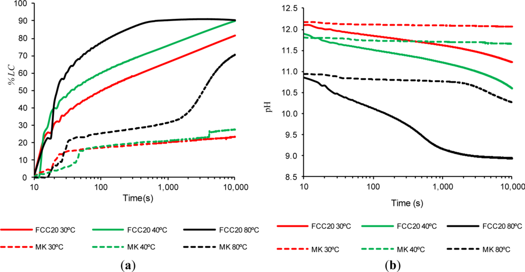The chemical reaction between calcium hydroxide and the pozzolanic material is influenced by the temperature of the suspension, which directly affects the reaction’s degree. Therefore, this experiment was developed to study the influence of the suspension temperature on the pozzolanic reaction. These experiments were conducted by comparing only the FCC20 to the MK, given that the previous experimental results showed that the inert materials (MU and AN) behave as such when assessed based on electrical conductivity (see Section 2.2). The temperatures considered in the experiment were 30, 40 and 80 °C. Initially, the concentrations of the Ca2+ and OH− ions are maintained (see Section 3.3, Experiment 3). Although the conductivity of each suspension increases with temperature [5], it was not necessary to make any correction given that the (%LC)t value is obtained as a ratio of conductivity data. Given that the results at 40 °C showed very high catalyst reactivity, the evolution of the loss of conductivity at two additional temperatures, 30 and 80 °C, was identified for further investigation, as well as the repetition of these experiments with MK as a comparison. The initial solutions of CH remained unsaturated at the three temperatures tested (the saturated concentrations of the aqueous solution of calcium hydroxide are 1.52 g/L at 30 °C, 1.41 g/L at 40 °C and 0.98 g/L at 80 °C [22]). Figure 3a shows the results for the loss of electrical conductivity percentage, when the ratio of pozzolan/CH used (1 g/40 mg in 50 mL of water) was held constant for the three temperatures studied. Figure 3b shows the evolution of the pH values for these same assays. Figure 3a shows that, for both pozzolans, increasing the water temperature of the suspension from 40 to 80 °C significantly increases the (%LC)t value. For FCC20, it can be observed that, at 80 °C, the (%LC)t reaches values above 90% at 660 s, which is the maximum (%LC)t value reached after 10,000 s in the 40 °C trial. After this time, the FCC20 fixates a minimal amount of additional calcium hydroxide; this result might be due to a coating on the catalyst’s surface of the products of hydration and, perhaps more importantly, due to the negligible amount of available dissolved calcium hydroxide. The (%LC)t values for FCC at 80 °C at 100, 1000 and 10,000 s are, respectively, 77.4%, 90.4% and 90.4%. The behavior of FCC20 at 80 °C is consistent with the measured pH values (see Figure 3b), which show a significant decrease between the beginning of the trial (pH value of 10.86) to values of approximately 9.17 after 1000 s, followed by a slight additional decrease to 8.94 after 10,000 s. This confirms that, in the final period of time under investigation, the concentration of the ions remains practically unchanged. When the temperature is reduced from 40 °C to 30 °C, it is noted that, for both pozzolans, the values of (%LC)t decrease slightly. For FCC20, the behavior is practically the same as that measured at 40 °C, with a difference in the (%LC)t values of approximately 10%. The (%LC)t values after 100, 1000 and 10,000 s are, respectively, 49.9%, 66.3% and 81.8% (see Figure 3a). This decrease in the reactivity of FCC20 when reducing the temperature from 40 to 30 °C can also be observed in the variation of pH values, corroborating the parallel behavior observed in both trials. The pH values range from 0.20 to 0.63 throughout the whole test (see Figure 3b).