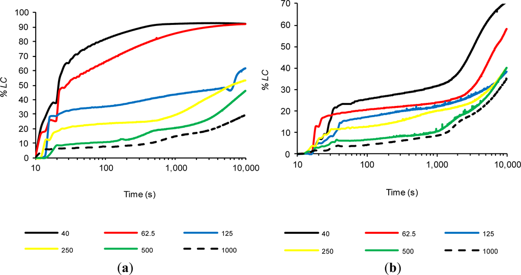 The (%LC)t of the calcium hydroxide suspension with FCC20 is far superior to that of MK, MU and AN, yielding a value of almost 90% (three times higher than that of MK) at 40 °C and 10,000 s.