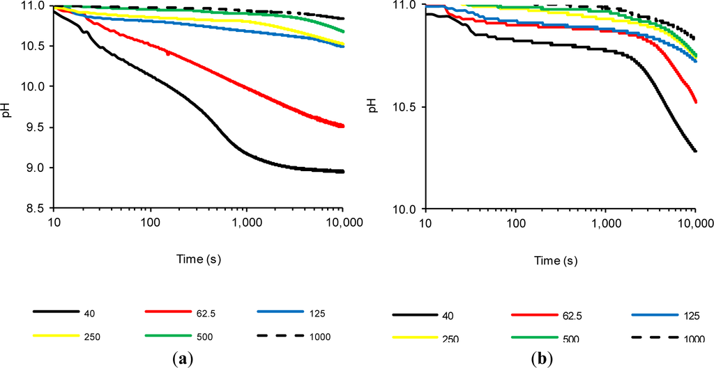 Previous tests confirmed that FCC20 consumes calcium hydroxide very quickly, because significant changes in the (%LC)t values were observed after a few seconds. Therefore, significantly lower variations were observed over time, as a result of the depletion of available calcium hydroxide, which had already reacted with the pozzolan (regardless of the test temperature). Therefore, it was decided to carry out a new method: a study in which the amount of calcium hydroxide was increased, while holding the amount of pozzolan added constant and performing the tests at 80 °C to obtain a faster pozzolanic reaction. Therefore, in this experiment, saturated solutions were also considered, where solid calcium hydroxide at 80 °C coexists. Due to the coexistence of solid CH and dissolved OH− and Ca2+ ions in these assays, the objective was to study the pozzolanic reaction when two processes were present simultaneously, i.e., ion fixing by the pozzolanic reaction and the dissolution of CH as a result of the loss of the saturation provoked by the pozzolanic reaction. Six suspensions were studied (Section 3.4, Experiment 4). Figure 4 shows the variation of (%LC)t over time for suspensions with both pozzolans (FCC20 and MK), and Figure 5 shows the evolution of pH over time for both pozzolans. For both pozzolans, it is evident that an increase in the CH/pozzolan ratio decreases the value of (%LC)t. For the spent catalyst (see Figure 4a), there is a significant decrease in the (%LC)t when the addition of calcium hydroxide is increased from 62.5 to 125 mg. This relationship (0.0625–0.125 g of CH/g of FCC20) is similar to the previously reported value [21] of the grams of calcium hydroxide fixed per gram of catalyst dosage between one and 14 days of curing for Portland cement pastes at a temperature of 20 °C (this value ranges from 0.05–0.08 g of CH/g of FCC20). The pozzolanic reaction is facilitated in this test by the use of an environment with a high proportion of liquid phase, a higher temperature and a pozzolan/CH system (without Portland cement), which explains why the values of the ratio are similar, even if the testing time is significantly lower (10,000 s). It is remarkable that, for tests with 125 mg or more of CH, the commencement of a second phase of pozzolanic activity can be observed for FCC20. This second stage has not been observed before, because the previous suspensions were always unsaturated. Under saturated conditions (for example, see the tests with 250, 500 and 1000 mg of CH), the first stage corresponds to a slight continuous increase in (%LC)t from the beginning of the test to approximately 1000 s. This increase is most likely due to the excess of CH, which increases the amount of dissolved ions that favor the pozzolanic reaction, but also causes a diminishing effect on the measurement of conductivity loss, given that new ions are continuously dissolved. That is, two processes are in competition, namely, the fixation of Ca2+ and OH− ions by the pozzolan, as well as the dissolution of solid calcium hydroxide. A second stage is visible at approximately 1000 s; at later times, the loss of electrical conductivity accelerates. This result can be explained by assuming that the more soluble fraction of calcium hydroxide particles has already been dissolved; hence, the speed of the pozzolanic reaction tends to be more important than the dissolution rate of calcium hydroxide. With respect to the evolution of pH relative to the use of FCC20 in these tests (see Figure 5a), the significant decrease in pH is again clearly visible when progressing from a solution with 125 mg of CH to 62.5 mg, which is in accordance with the evolution of the electrical conductivity values of the suspensions.