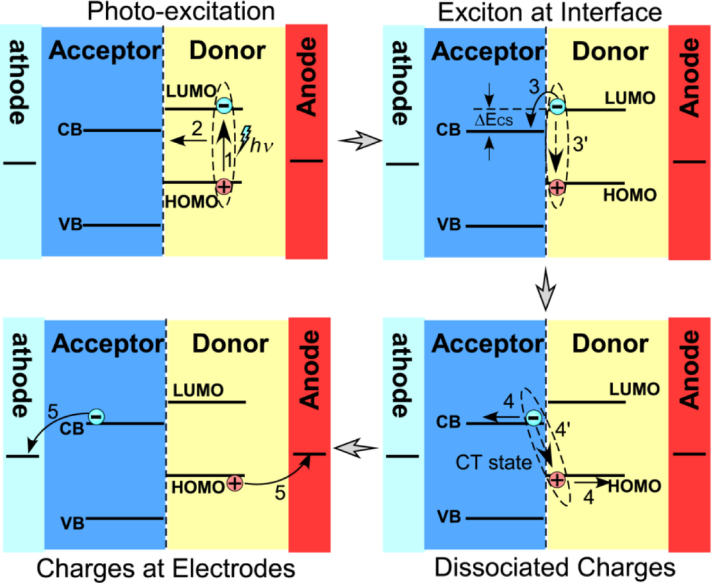 The interfacial charge separation is one key step in the photovoltaic processes of the hybrid materials. However, factors controlling the interfacial charge separation are not fully understood. It is commonly believed that a photogenerated exciton dissociates to generate a bound complex with charge transfer character at a donor:acceptor heterojunction and then separates into fully dissociated charge carriers [4–6] as illustrated in Figure 1. Here, the efficiency of charge generation depends on whether the interfacial charge separation can successfully compete with the recombination of the bound charge transfer complex and with the energy transfer to singlet or triplet excitons of either component. During this process, factors, such as the interface area, the nominal interfacial driving energy (the differences in energy level across the interface), the morphology of the interfaces/domains, the interfacial layer/molecules/bridges, the crystallinity of the components, the mixture homogeneity, and the migration of separated charges from the interfaces, can influence the charge separation rate.