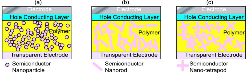 Because the interfacial charge separation is the critical step in the whole photovoltaic process, the larger the interfaces, the more the opportunity for the excitons to reach the interfaces, and probably the higher the conversion efficiency. Therefore, most of the hybrid photovoltaic materials that have been studied are nano-structured composites. There are many types of nanostructures, including particles, rods, tubes, tetrapods, sheets, needles, and porous network, etc., and the way to mix the components together can be either disordered or ordered as shown in Figure 2.