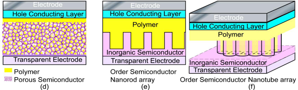 There are other various choices of hybrid structures for the disordered nanocomposite system. Among them, the nanoporous structure (Figure 2d) is of great interest, and many attempts have been made based on porous inorganic semiconductors, such as TiO2 [137–139], CdS [140], ZnO [141], CdSe(ZnS) [142] etc. De Freitas et al. compared films of P3HT:aerogel of CdSe(ZnS) with films of P3HT:quantum dots with a similar ratio of each component, where the films of the P3HT:aerogel showed increased photocurrent and charge generation. This was attributed to the existence of a more interconnected network, which extended the lifetime of the photoinduced charge separated state and reduced the chance of recombination of the separated charges [142]. The idea of an interconnected network of the hybrid components in the systems is the same as using branched inorganic nanoparticles when mixing with conducting polymers. However, the performance of this type of photovoltaic cell achieved is still not as good as expected, because there are still other factors that can limit the power conversion efficiency, e.g., poor contact between the porous semiconductor and the conducting polymer. Therefore, improvements are still eagerly anticipated for this type of photovoltaic material, particularly in obtaining better interfaces between the polymer and the porous inorganic base.