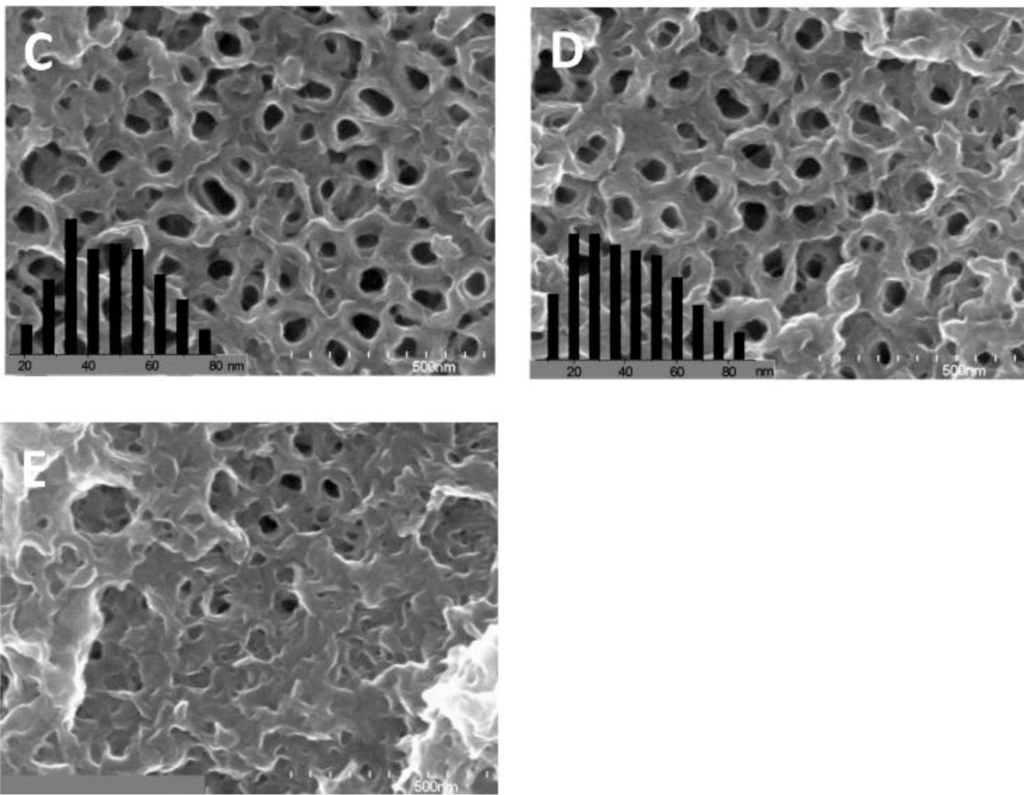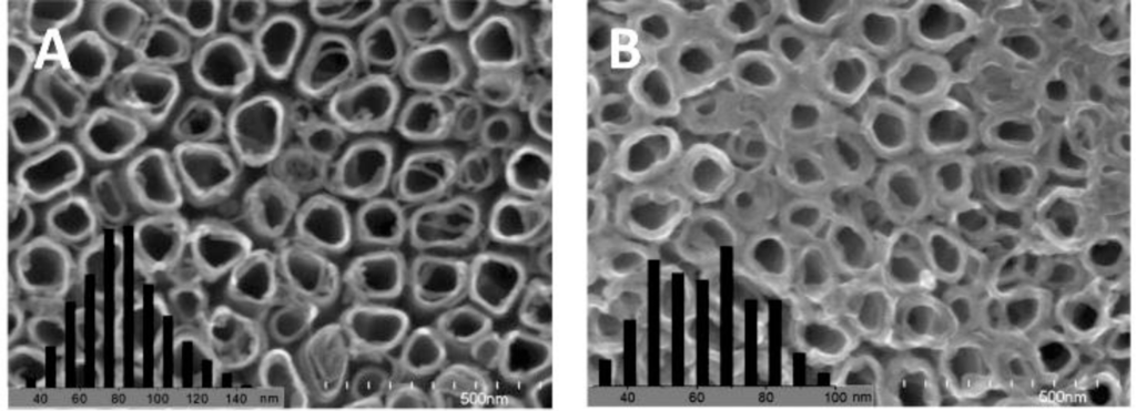 To increase the interfacial area in the ordered nano array hybrid system while keeping the effective charge transport pathways, ordered nanotube arrays as shown in Figure 2f were used. [15,88,90,161–172] However, experimentally those nanotube arrays were not as perfect as displayed in Figure 2f, e.g., a typical FESEM of TiO2 nanotube arrays as shown in Figure 3 [170], so improvements in the chemical/electrochemical synthesis are needed. Nevertheless, a better performance of the ordered nanotube array based system is expected because of the larger interfaces than their nanorod equivalents. However, similar to the ordered nanorod array based system, the PCE for TiO2 NTA based systems reported by different groups varied by more than one order of magnitude (Table 1). [15,88,90,161–169] Again, the introduction of third party molecules/materials at the interfaces can greatly increase the PCE of these hybrid systems. Li et al. [15] reported that the PCE of the hybrid system Au/P3HT/CdS-NTA/FTO has a ~4 fold increase in the PCE compared with the hybrid system Au/P3HT/NTA/FTO. Besides the CdS shell, quite a few dyes [164,165,169] and PCBM[88,161,163] have also be incorporated into the P3HT/TiO2-NTA system, and in most cases the PCE can exceed 1%. For example, Shankar et al., reported a PCE of 4.1% in a hybrid system of P3HT-PCBM-TiO2 [163]. Interestingly, to improve the infiltration of conducting polymers into NTAs and their contact, in situ electrochemical polymerization of polythiophene was utilized, but the PCE of 1.46% obtained was not as good as expected. Thus, although this improvement may not be significant, it should still be the right direction to get better interfaces between inorganic and organic components in these ordered hybrid systems. However, there are still quite a few other factors that cannot be neglected.