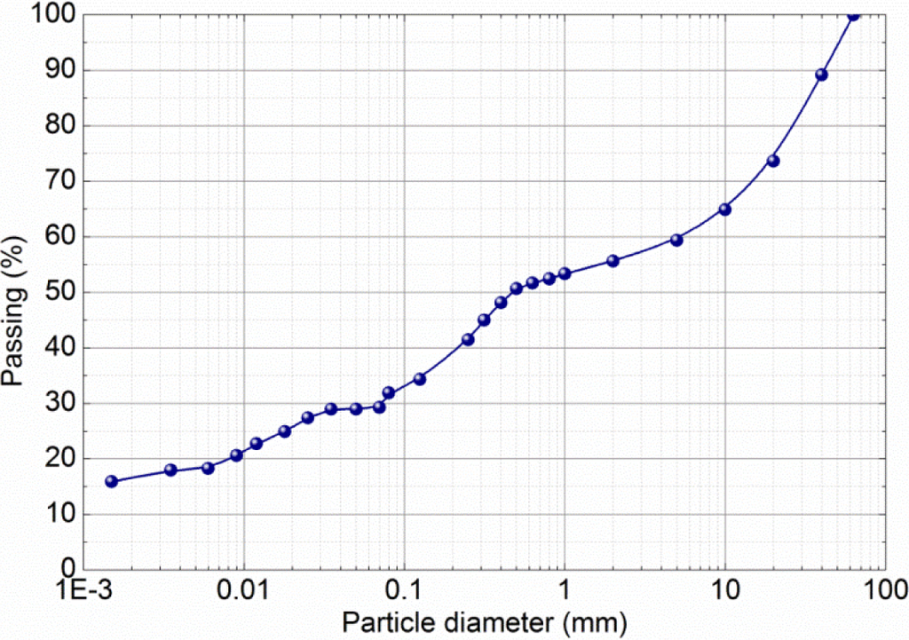 The studied material comes from the construction site of a rammed earth house built in 2011 in France. It is a local earth mixed with 2.5% (in dry weight) of NHL5 lime. Its characteristics are presented in Table 1 and particle-size distribution (following the NF P 94-056 and NF P 94-057 standards [32,33]) in Figure 2.