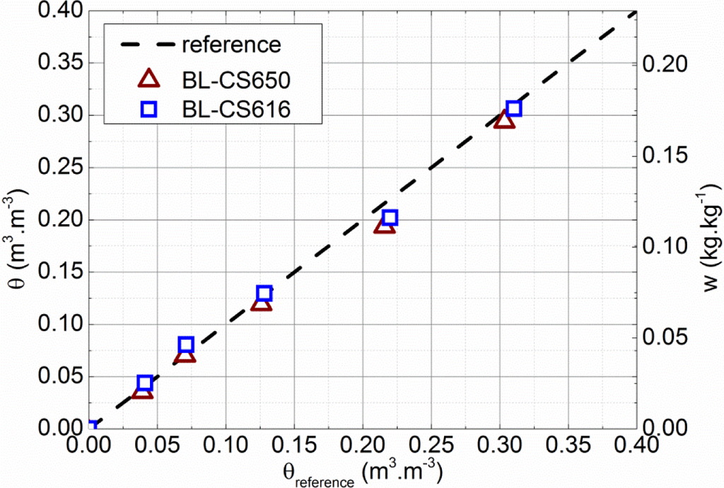 The resulting calibration coefficients are: A = 0.84 ± 0.07; B = 0.014 ± 0.01; C = 47.07 ± 1.79; D = 2.41 ± 0.01; for the CS650 and to A′ = 1.38 ± 0.18; B′ = 0.014 ± 0.01; C′ = 51.06 ± 4.69; D′ = 2.40 ± 0.01 for the CS616.