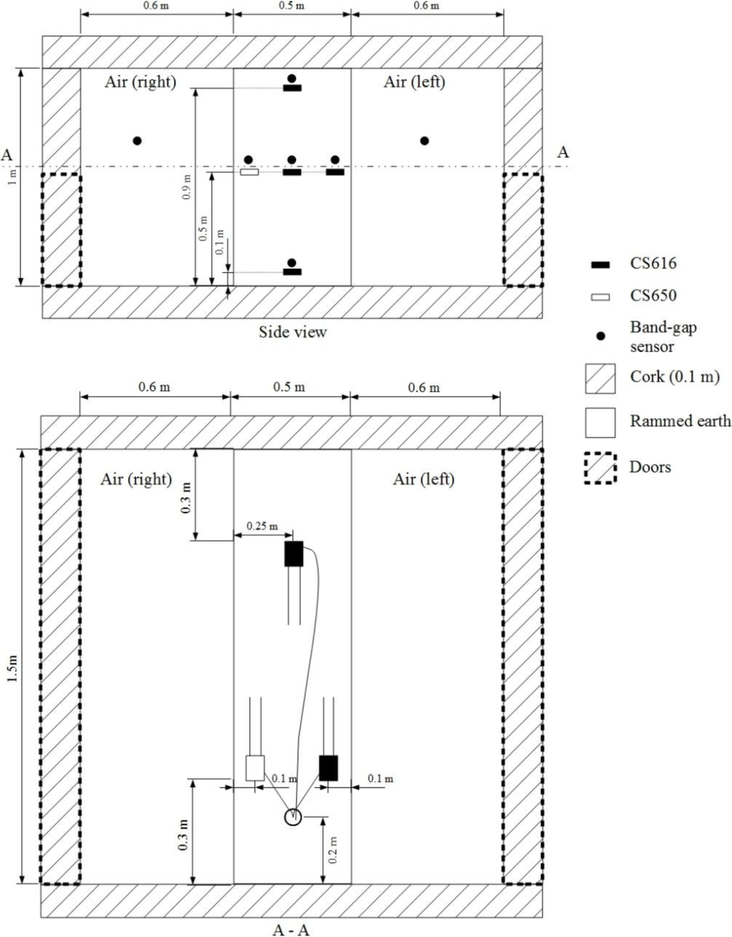 The calibration procedure was used to study the hydric behavior of a full scale earth wall of dimensions 1 m ×1.5 m × 0.5 m equipped with five TDR probes and five band-gap sensors. Three CS616 are positioned at the mid thickness and at three different heights: 0.9 m (top), 0.5 m (middle) and 0.1 m (bottom). At 0.5 m height, one CS616 and one CS650 are installed at 0.1 m of both faces of the wall. At this particular height, according to the manufacturer, probes are placed in a staggered configuration to prevent any electromagnetic interference. To avoid any damage, the probes are surrounded by loose material before ramming. In addition, three nails are used to keep the probes in their initial position. The temperature is measured by band-gap sensors placed just above each TDR probe. Two other band-gap sensors are also installed on the right and left ambiances of the box. This implementation is illustrated in Figure 4.