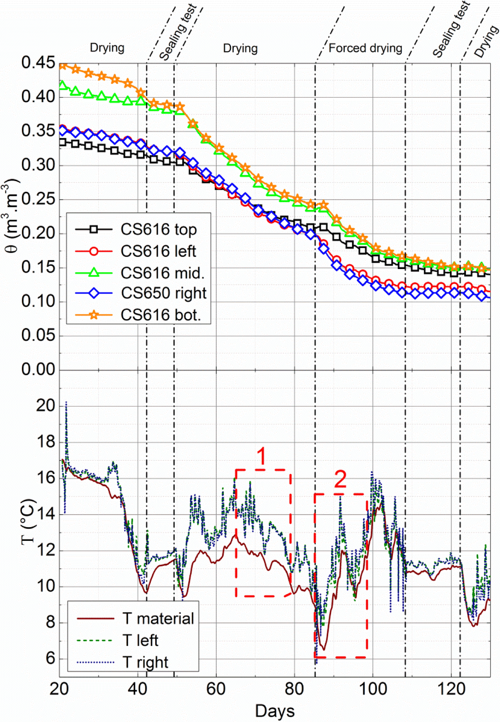 Let us now focus on the coupling between water content and temperature measurements. When the volumetric water content variation remains quite small (e.g. last sealing tests or end of the drying curve), no significant differences are observed between the temperature within the box and the one within the wall. However, as sketched in Figure 2, during the period where the water content significantly decreases (from 51st to 110th day), a significant decrease of temperature inside the wall is observed. A simple way to explain this temperature variation is to use the thermal equation in its uni-dimensional form for porous media with in-pore water phase change [39]: