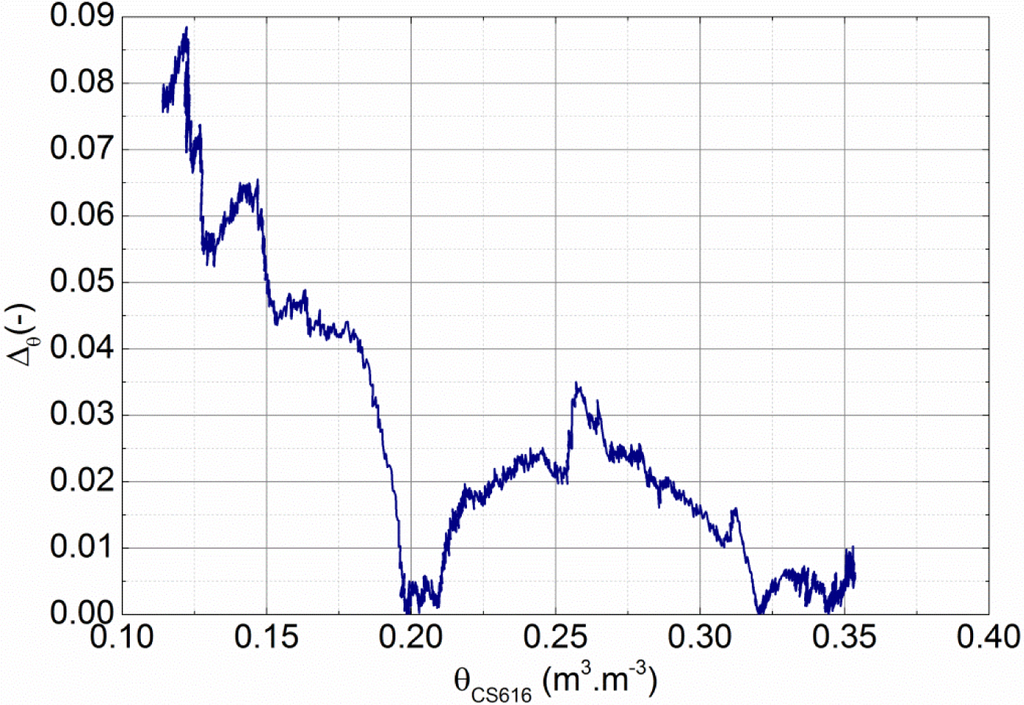 Consequently, to calibrate the probes, blocks at given volumetric water content (0%, 7.1% and 13.9% for the CS650 and 0%, 9.8% and 14.8% for the CS616) are wrapped in plastic film and put in an oven at a controlled and fixed temperature until the stabilization of the probe output signal. The temperature homogeneity is controlled by comparing the temperatures inside the oven and inside the sample. An additional volumetric water content is used, three instead of the two which are necessary in order to estimate the error on the coefficients. Results are reported in Table 2 for the CS650 and in Table 3 for the CS616.