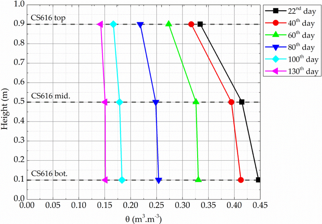 In addition, a decrease with height in the measured volumetric water content is observed (i.e., θtop <θmiddle <θbottom). As sketched in Figure 7, this difference decreases with time, and the volumetric water contents measured by the three probes converge to a mean value of 6.8% ± 0.15%.