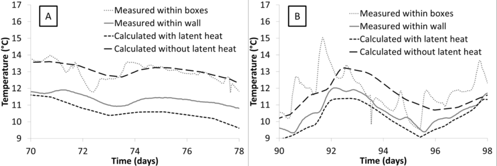 First, for both simulations (e.g. natural drying and forced drying), the calculated values with latent heat are very close to measured values, which is not the case for simulations without latent heat. They however tend to overestimate the latent heat effect; this may be due to the use of Equation (10), which overestimates the evaporation rate by neglecting the effect of water transport on water content variations. This result is, by itself, another proof of the accuracy of the volumetric water content measured by the probes. Indeed, the temperature decrease due to phase change is very sensitive to the amount of water that evaporates, and thus to the measurement given by the probes.