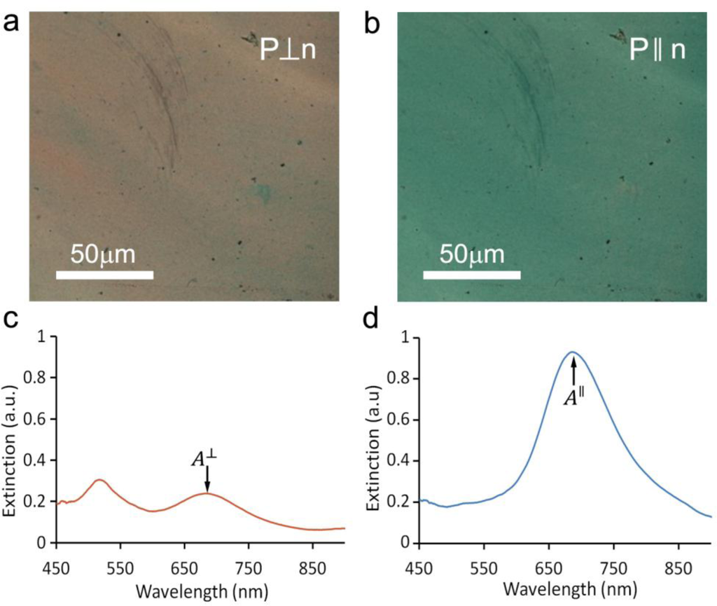 where θ is the angle between the long axes of rods and the director n (describing local average orientation of these constituent rods). In our system, S is equal to the scalar order parameter corresponding to the longitudinal transition dipole moment. Therefore, the order parameter of GNRs can be deduced from the polarized optical transmission data by first determining the absorbance A∥ and A⊥ at the longitudinal SPR peak for polarizer orientations parallel and perpendicular to n, respectively and then using the expression