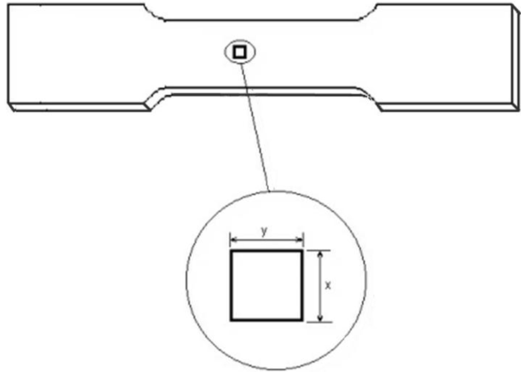 Let us consider a tensile test of a solid material using a thin specimen with a uniform thickness, as presented in Figure 1. The thickness of this specimen is considerably smaller than its other dimensions, so it is almost a plane stress problem. Consider a piece of such a test specimen which contains all the solid phases which have been formed during solidification or after the heat treating process. For example for an as-cast material this piece of material must be big enough to contain several solid grains and grain boundary phases, thus it is able to demonstrate the heterogeneous characteristic of the solid material satisfactorily. For simplicity, a rectangular domain having x, y dimensions has been chosen.