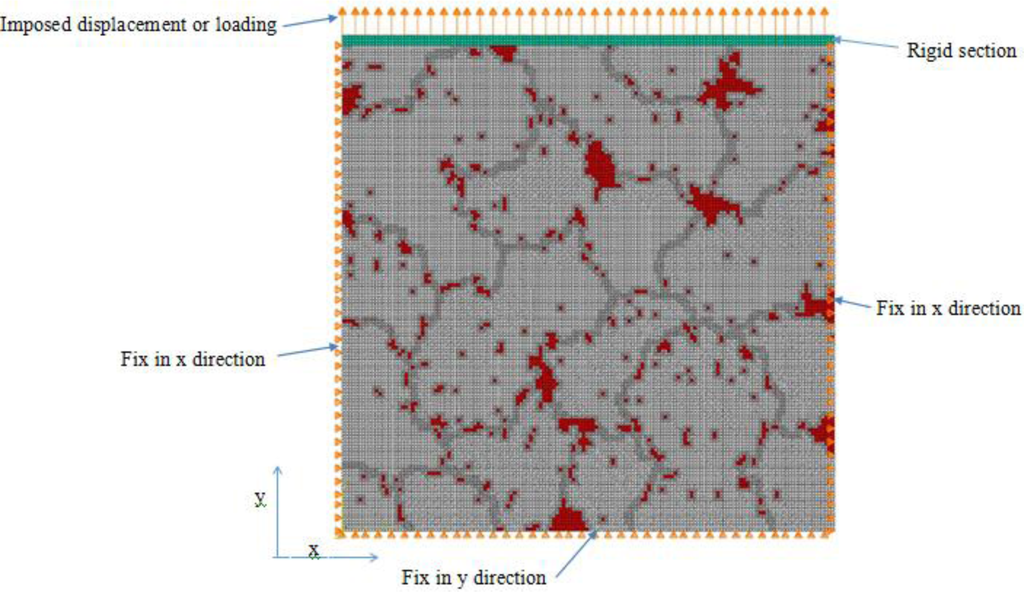 Using our grain generation procedure, different grain structures were created and converted in a finite element mesh. The mesh was thereafter introduced in the finite element software package ABAQUS. The Al-4.6% Cu was considered to have 4.4 volume percentage (vol%) of θ phase, among which, approximately 2.5 vol% was present in the channels generated by the connection procedure. The thickness of each channel, between two grains, was chosen randomly as mentioned in the previous section. Different loading and boundary conditions were applied. In these analyses, the α phase elements were considered as an elastoplastic material and the θ phase as an elastic material until its fracture point.