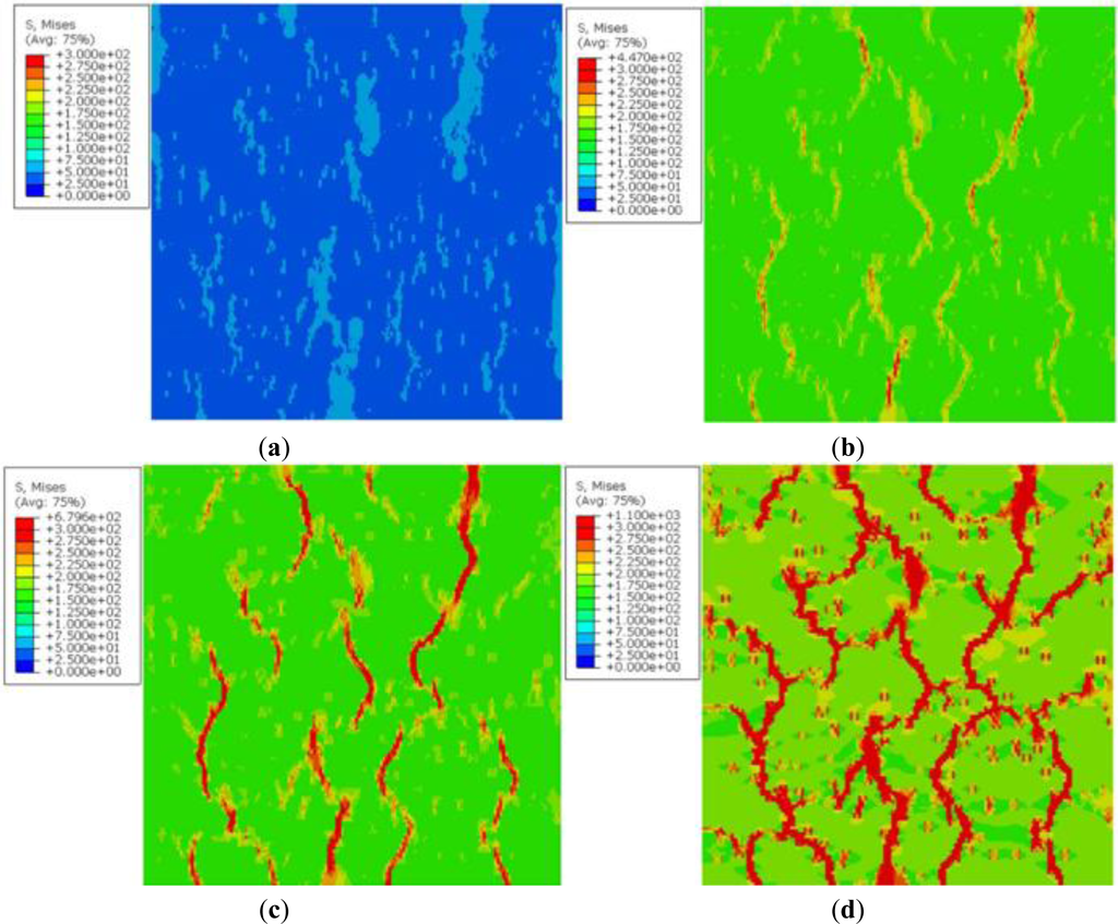 As an example, Figure 11a–d present the Von-Mises stresses at different strains. These figures show how these stresses increased inside this heterogeneous material as tensile stretching occurs. One can see that the grain boundary zones are transferring a considerable amount of loading from top to bottom, if one compares Figure 11d with Figure 10.