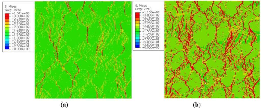 The distribution of the Von-Mises stresses at approximately the same imposed strain of Figure 11d, in a 1.5 mm × 1.5 mm RVE, are displayed in Figure 12b for the discretized microstructure presented in Figure 5c in a 2 mm ×2 mm RVE. The latter have a resolution of 5 μm instead of 10 μm in Figure 6f. As one can see, the stress patterns are similar though having better resolution stress contours.