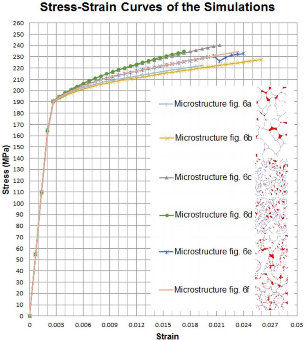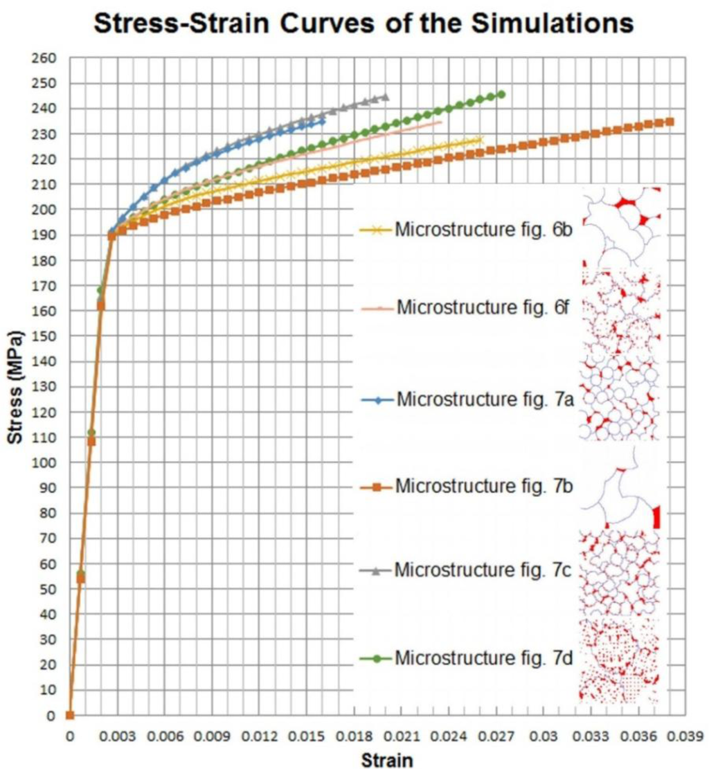To see the effect of the grain sizes on the mechanical properties of the alloy, microstructures of Figure 7a–d have been analysed with the same loading and boundary conditions. Figure 14 presents the stress-strain curves calculated.