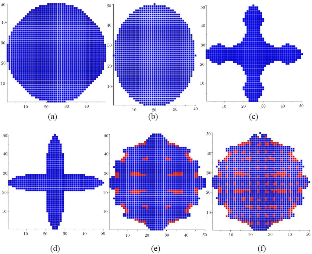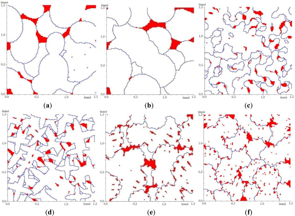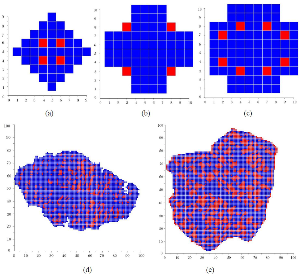 Figure 2a–c show some basic grain shapes used for a coarse representation of the grains. Here, each basic grain is constructed in an array of 10 × 10 or 9 × 9 elements. The blue squares in these figures represent the α phase elements while the red ones represent θ phase elements.