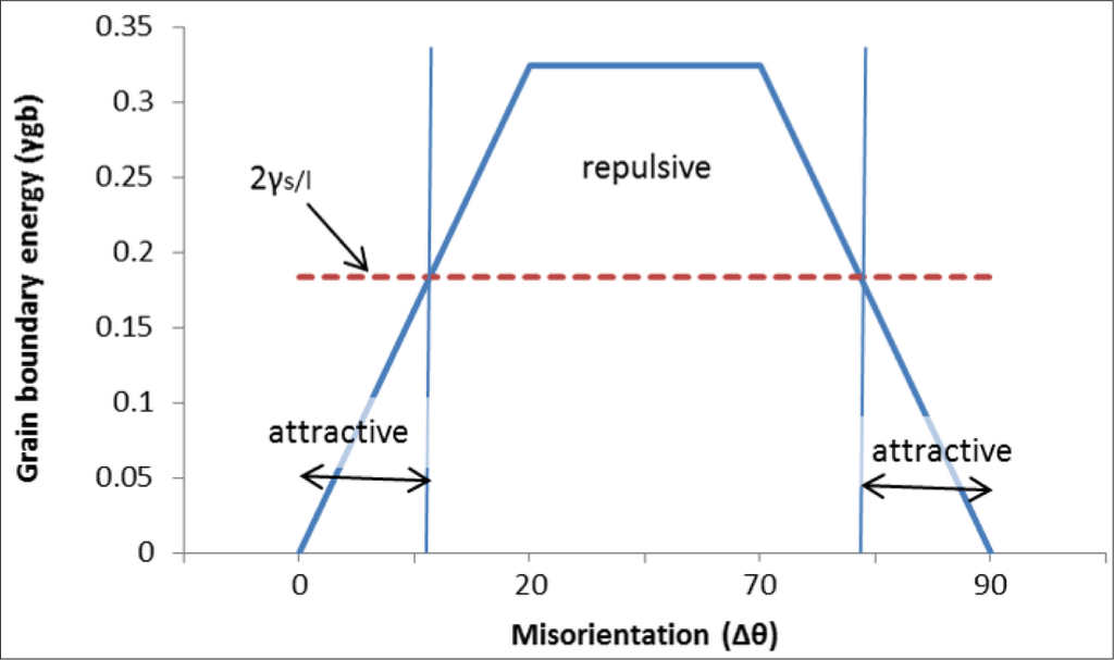 Hasson and Goux [13] considered the grain boundary energy (γgb) as a function of the misorientation of the grains (Δθ) for an aluminum alloy. A simple approximation of this function was given by Mathier et al. [14], as presented in Figure 4. Rappaz et al. [15] considered the merging and the coalescence of two flat solid-liquid interfaces of unit area. They stated that the coalescence can be seen as the disappearance of two solid-liquid boundaries, each with energy γs/L, and the formation of a solid-solid grain boundary with energy γgb. Considering that γgb < 2γs/L, then the free energy will be decreased if the solid-solid junction is formed. So it is an attractive situation. Looking at Figure 4, it can be seen that such a situation will happen for a low-orientation difference between two adjacent grains, namely if 0° ≤ Δθ ≤ 11° and 79° ≤ Δθ ≤ 90°. If γgb = 2γs/L then the free energy stays the same whether or not the solid-solid junction is formed. This refers to the neutral case. On the other hand, if γgb > 2γs/L, then the free energy will be increased if the solid-solid junction is formed. So, it is a repulsive situation. Considering Figure 4, one concludes that such a situation can happen for high-orientation differences between two adjacent grains.
