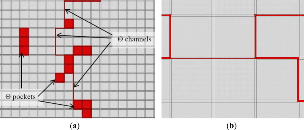 Creation of α phase finite elements are straightforward since each α element of the discrete domain can be presented as an α phase finite element. This is also true for the θ pocket zones as each θ element of the discrete domain can be converted to a θ phase finite element. The sole difficulty is the presentation of the θ phase channels.