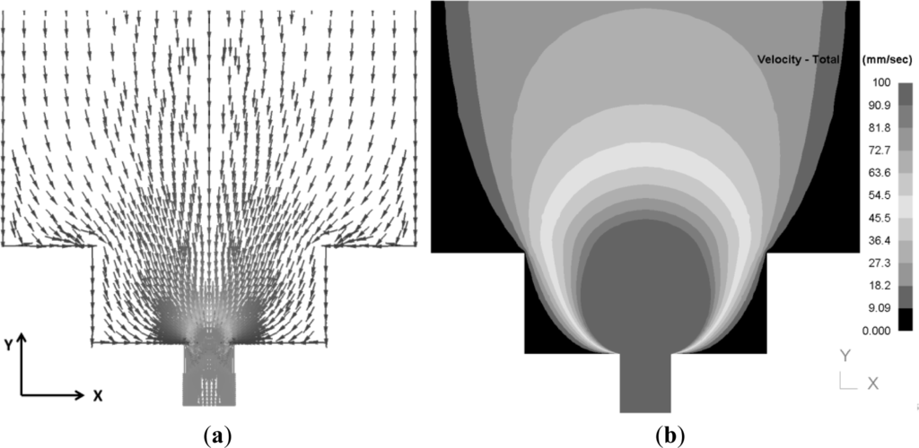 Using MATLAB software, results for velocity flow fields from the FEM model were processed so that details of the flow pattern and transverse weld thickness could be determined. The first step in the post processing of the FEM results was tracking different points through the velocity field from the billet during extrusion and into the final extrudate. Figure 10 shows the direction and magnitude of velocity for each nodal point in the billet for an extrusion ratio of 70.