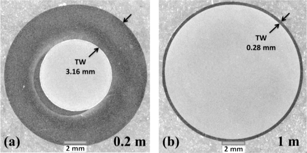 Figure 2 shows cross-section images of transverse weld (black ring) at the start (a) and the middle of transverse weld (b). As shown in Figure 2a, at the distance of 0.2 m from stop mark the thickness of the clad layer is 3.16 mm and at the distance of 1 m, Figure 2b, the transverse weld is 0.28 mm.