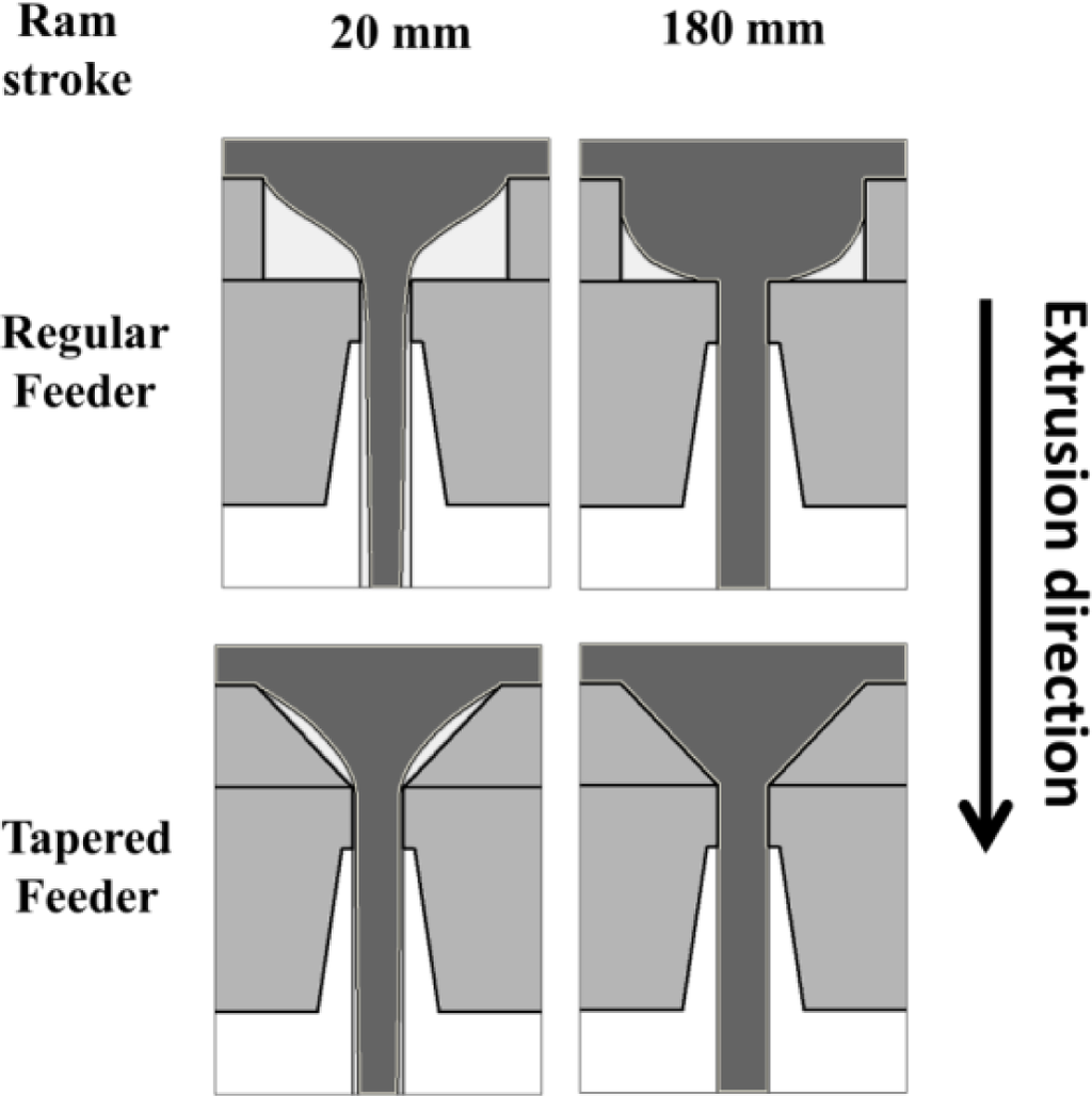Figure 3 shows the model-predicted effect of feeder geometry on the material flow and dead metal zone during a round bar extrusion with extrusion ratio of 70. The first snapshot on the left is for a ram stroke of 20 mm which is 4 mm after the break through. During the entire extrusion, the previous billet material left inside the regular feeder geometry is much larger than that of the tapered feeder. This arises from both the lower initial volume of material remaining inside the tapered feeder from the first billet as well as the different metal flow pattern. At the end of the extrusion (ram stroke of 180 mm for this case), there is no prior billet material left in the tapered feeder but there is some prior billet material left inside the regular feeder.