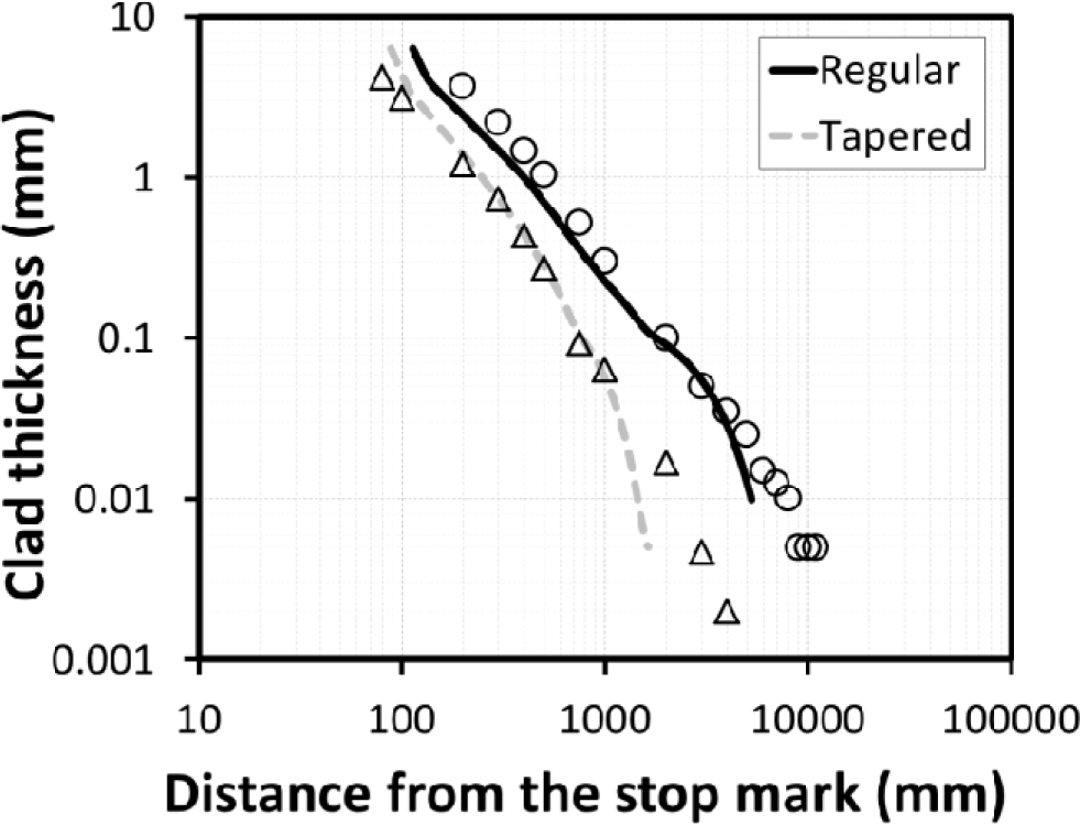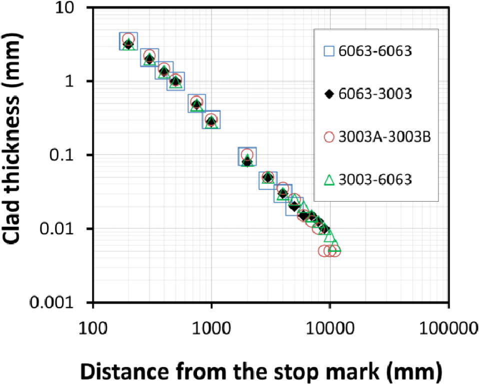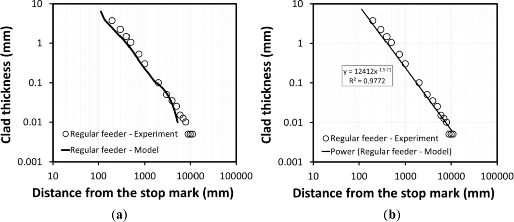 Experimental measurements and model predictions indicate that the thickness of the clad layer as a function of extrudate position fits well with a power law with an exponent of −1.6.