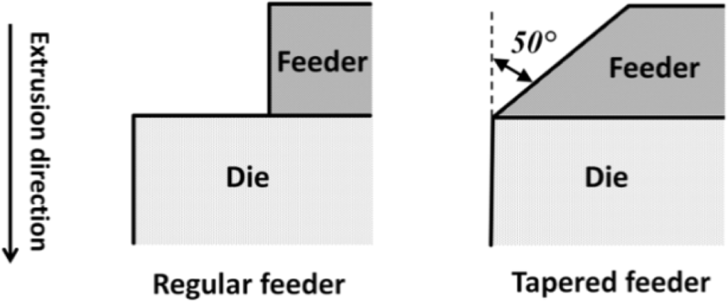 For round bar extrusion using a simple cylindrical feeder, the simulations indicated that material from the preceding billet is still present in the dead zones of the pocket such that the surface of the product can be contaminated over the entire length. In the case of the tapered pocket, material from the preceding billet clears from the pocket during the push, significantly decreasing the transverse weld length.