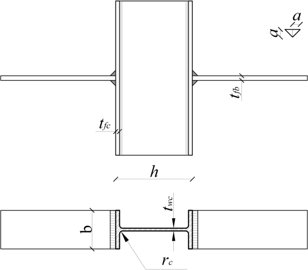 In the above equation, twc and tfc are the column web and flange thicknesses, respectively, tfb is the beam flange thickness, rc the column fillet root radius, a the throat thickness of the fillet weld connecting the beam flange to the column one and fy is the specific yielding strength.