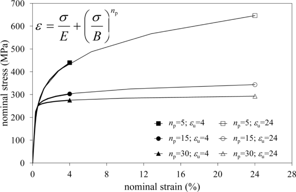 The part of the panel zone under horizontal tensile stresses transmitted by the beam flange could be also subjected to vertical stresses due to the presence of column axial loads. The interaction between these stresses could produce a reduction in tension strength of the column web. In order to investigate this aspect, a parametric study has been carried out. The analysis described in the previous section has been repeated considering different values of axial load on the column. In addition, several materials have been taken into account by imposing Ramberg-Osgood relationships characterized by a unique conventional yielding strength f0 of 250 MPa, two different ultimate strains (εu = 4, 24) and three strain hardening parameters (np = 5, 15, 30). In this way, six different material stress-strain relationships, which are depicted in Figure 4, have been examined.