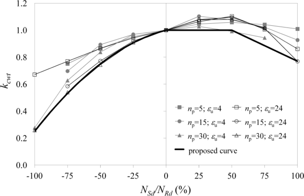 The obtained numerical results are reported in Figure 5, where the kcwt factor given in Equation (8), namely the ratio between the numerical measure of the component strength FRd,N and the strength given in Equation (4), is expressed as a function of the ratio between the column axial load Nsd and the corresponding axial strength NRd: