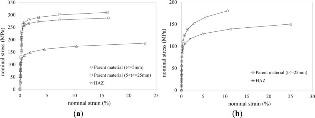 For each section geometry and parent material, three cases of analysis have been run with the same numerical procedure previously presented. For the first case (Case 1), it has been assumed that the whole specimen is made of the parent material only. For the second case (Case 2), parent and heat affected materials have been selected according to the correct stress-strain relationship shown in Figure 6. For the third case (Case 3), it has been considered that the whole specimen is made of the heat affected material only. Therefore, the analysis related to “Case 2” resembles the actual behaviour of the specimen under investigation, while, “Case 1” and “Case 3” are considered as reference limit cases.