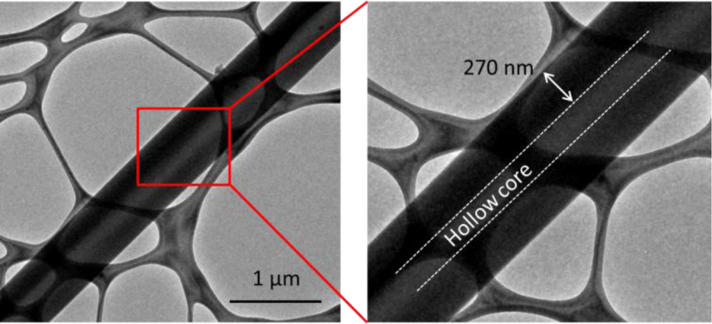 However, given its diffusive nature, the thermal stabilization of CFs is not only controlled by the penetration depth of oxygen, but also by the rate of the stabilization of the core. That is, under accelerated stabilization conditions, e.g., relatively high stabilization temperatures, CNFs with radial inhomogeneity may also form. Moreover, rapid thermal stabilization may also induce radial inhomogeneity in submicron carbonized fibers. To further demonstrate this effect, we fabricated two types of CNFs (type I and II) by electrospinning a 12 wt% solution of PAN in DMF at a respective electrospinning distance and voltage of 20 cm and 16 kVs. CNFs of types I and II were fabricated by thermal stabilization of PAN nanofibers at 264 °C and 294 °C, respectively, followed by carbonization at 1100 °C. SEM images revealed that the diameter of the nanofibers were mostly in the range of 200–800 nm. The samples were then observed in TEM. The type I CNFs (stabilized at 264 °C) did not show any sign of radial inhomogeneity. However, in type II (stabilized at 294 °C), there seems to be a critical diameter of ~500 nm above which nanofibers with a hollow core will form, as shown in Figure 1.