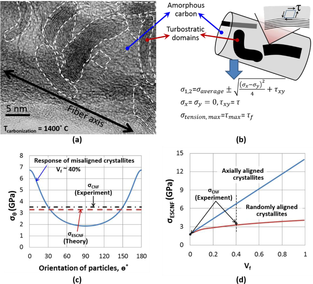 According to this preliminary analysis, high degrees of alignment of crystallites with the fiber axis (at θ ~ 0° in Figure 2c), without changing the degree of crystallinity, while maintaining vf ~ 40%, can increase strength of CNFs by ~100% to ~7 GPa (the vertical broken line in Figure 2d). In addition, with basal planes of the turbostratic domains oriented parallel with the nanofiber axis, the model predicts higher strengths with increased crystallinity (Figure 2d). According to the model, if CNFs are almost entirely composed of turbostratic domains with their basal planes parallel to nanofiber axis, an upper limit for the strength of CNFs, ~14 GPa, can be achieved (Figure 2d).