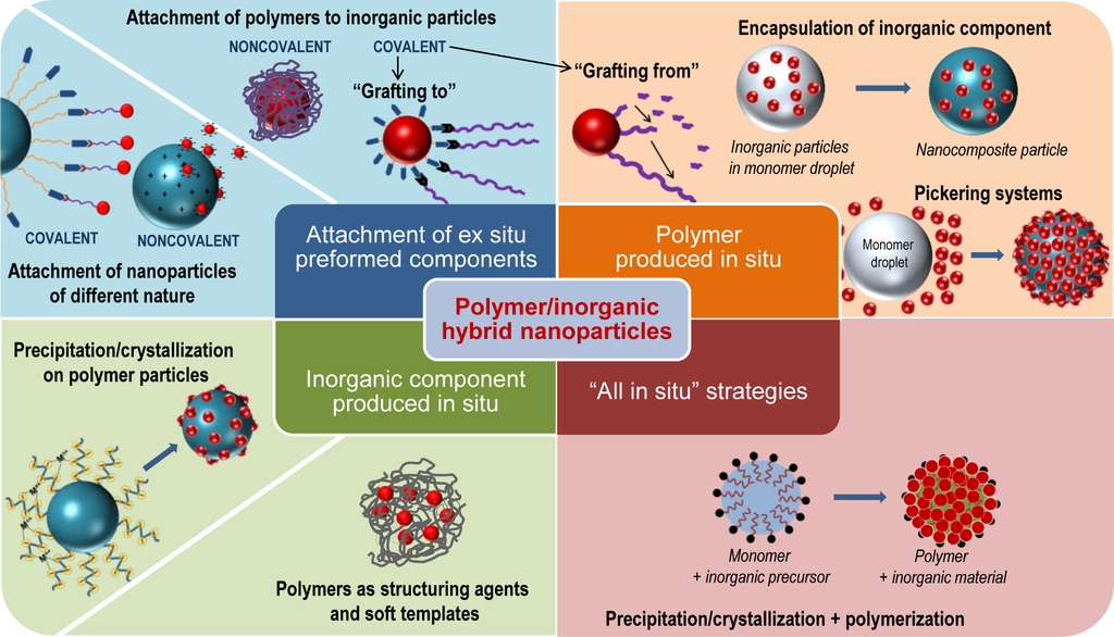 This article reviews the recent advances and challenges in the preparation of polymer/inorganic hybrid nanoparticles. We mainly focus on synthetic strategies, basing our classification on whether the inorganic and the polymer components have been formed in situ or ex situ, of the hybrid material. Accordingly, four types of strategies are identified and described, referring to recent examples: (i) ex situ formation of the components and subsequent attachment or integration, either by covalent or noncovalent bonding; (ii) in situ polymerization in the presence of ex situ formed inorganic nanoparticles; (iii) in situ precipitation of the inorganic components on or in polymer structures; and (iv) strategies in which both polymer and inorganic component are simultaneously formed in situ.1. Introduction