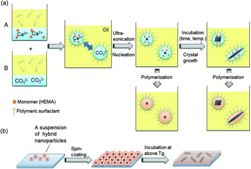 One of the few cases was presented by Fukui and Fujimoto [125], who reported the formation of calcium carbonate in parallel to the polymerization of 2-hydroxyethyl methacrylate (HEMA) in water-in-oil systems. It is know that CaCO3 presents different thermodynamically unstable polymorphs that can be stabilized by addition of additives [126]. In their work, Fukui and Fujimoto [125] monitored the formation of these unstable crystals and their transition over time (and with annealing) to more stable polymorphs by “freezing” the evolution of CaCO3. CaCO3 was formed from precursor droplets containing Ca(NO3)2 and Na2CO3, which were first separately formed into droplets by emulsification in the presence of HEMA, followed by mixing of the two pre-emulsions by a final emulsion. The evolution of CaCO3 crystals was observed by initiating the polymerization of HEMA via addition of an initiator after a certain amount of time, as seen in Figure 10. Interesting rod-like morphologies and the formation of amorphous calcium carbonate could be achieved [125].