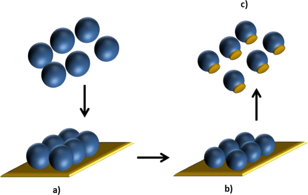 The assembly of nanoparticles into organized structures is important in the design of next generation materials that can form hierarchical structures. In the examples of Section 3.2, assemblies of nanoparticles of different natures had been shown to lead to hybrid structures. The arrangement of nanoparticles can also be used as a preparation strategy to obtain hybrid nanoparticles. In this sense, Yu et al. [128] described a versatile strategy for engineering binary and ternary hybrid particles through a combination of etching and deposition processes based on colloidal lithography (Figure 11). Utilizing chemical or plasmonic etching procedures, polystyrene particles were attached to a gold layer, etched to reduce their diameter in a controlled way and gold patches were generated underneath the colloidal template, where the attachment on the microspheres was successfully optimized by thermal treatment. The hybrid particles composing metals and polymers were tunable in size, composition, and morphology.