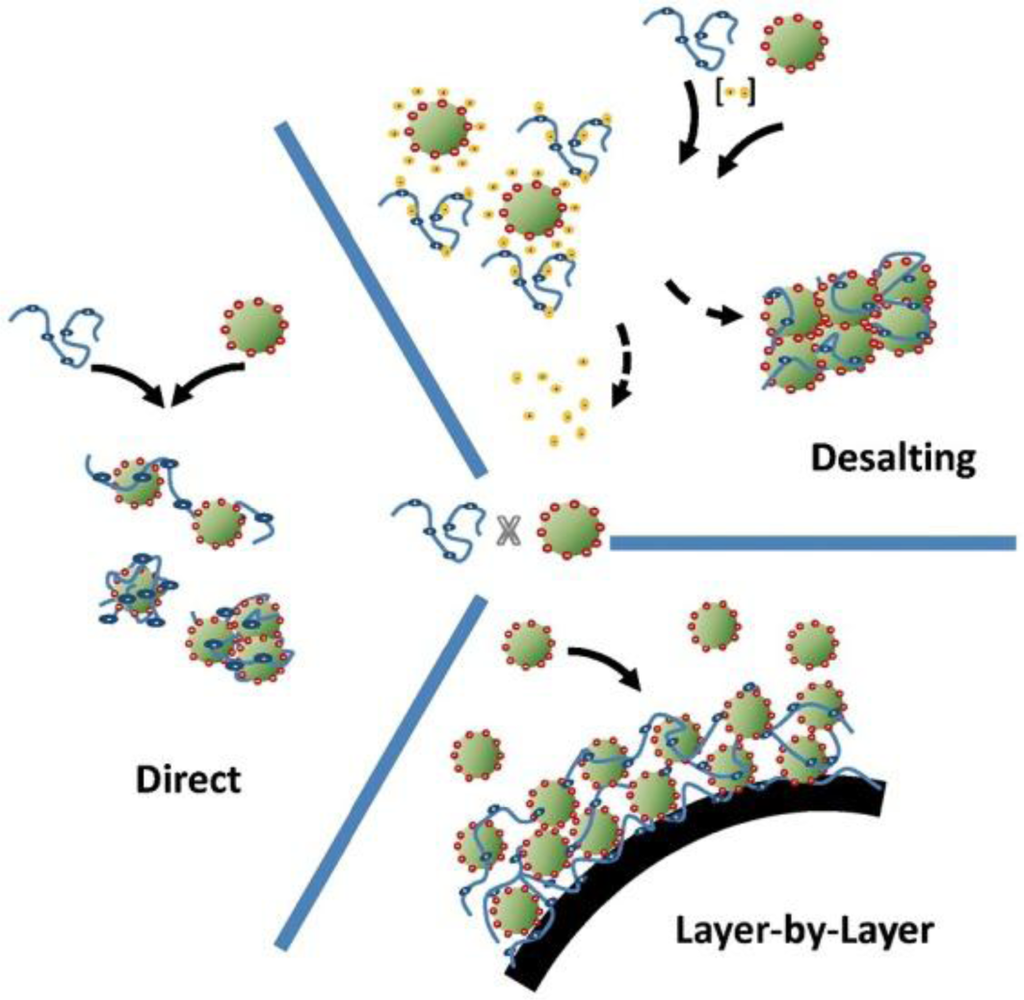 Polymeric coatings on inorganic nanoparticles can be prepared by taking advantage of the electrostatic interactions that occur between a charged polymer (polyelectrolytes and ionomers) and the charged surface of an inorganic particle. A good review on deposition of polymer chains onto nanoparticles has been written by Chapel and Berret [16]. Figure 2 shows the three main methods highlighted by these authors in using electrostatic interactions of polymers and nanoparticles in forming coatings and, thus, hybrid nanoparticles: (i) direct addition; (ii) desalting; and (iii) layer-by-layer. The direct addition consists of the mixing of both components together to form aggregates of the two oppositely charged species. In a desalting process, both the inorganic particles and the polymers are dispersed within a media and are stabilized from interacting by the presence of salt ions. The removal of the salt allows for a more ordered aggregation to begin, because the desalting rate can be controlled. Finally, the layer-by-layer (LbL) deposition allows the formation of highly controlled coatings, which can yield attractive hierarchical morphologies, but through a quite time-consuming process.