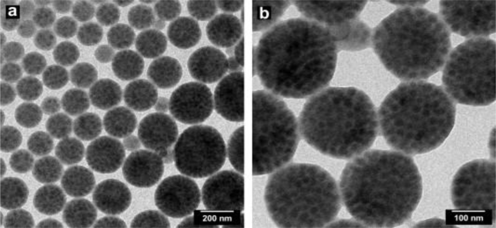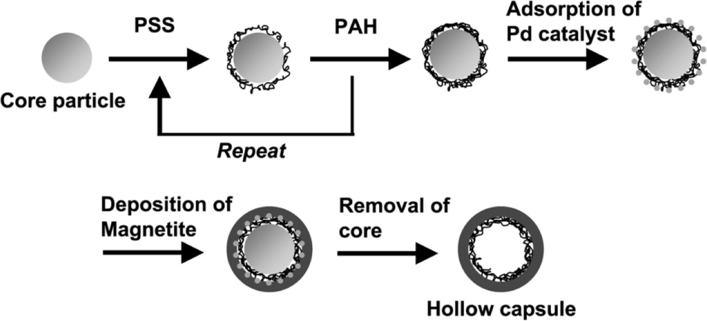 The formation of hybrid nanocapsules is also possible by applying the LbL approach. Hollow silica and silica/polymer spheres were formed by deposition of silica nanoparticles and polymer onto colloidal templates. The wall thickness of the capsules can be controlled by varying the number of nanoparticle and polymer deposition cycles. By changing the morphology and size of the colloid template, the capsule structure can also be varied [28]. Nakamura et al. [29] prepared Fe3O4/Pd/polyelectrolyte hybrid capsules by this technique (Figure 3). LbL assembly of polyelectrolytes onto melamine/formaldehyde particles was followed by the adsorption of palladium catalysts onto the poly(allylamine hydrochloride)-terminated surface. Afterwards, Fe3O4 nanoparticles were deposited on the top of the structure. Fe3O4/polyelectrolyte hybrid capsules can be particularly interesting for medical applications.