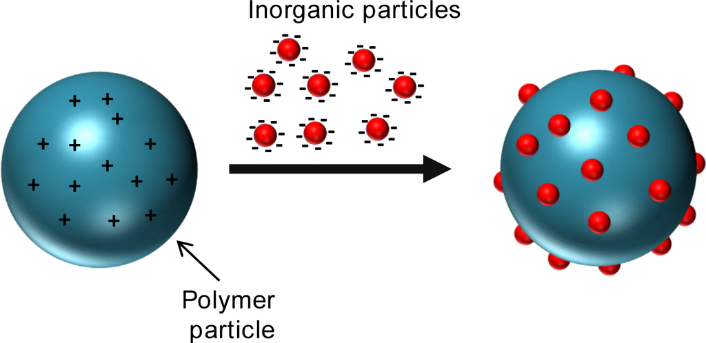 An additional way to achieve the interaction between two materials of completely different natures is to modify their surfaces and then use the so-called “heterocoagulation” technique, schematically depicted in Figure 5. The heterocoagulation implies the interaction and aggregation of particles of different nature to form a hybrid product. Wagner et al. [42] reported raspberry-like particles obtained by heterocoagulation of binary mixtures of oppositely charged colloids. The authors used an organic core of cross-linked polystyrene particles functionalized at the surface with amino groups and three types of inorganic particles, namely anionic silica, gold precipitated in the presence of trisodium citrate dihydrate, and maghemite precipitated in the presence of poly(acrylic acid) and diethylene glycol. The process is simple: the polystyrene particles were added dropwise to a suspension of inorganic nanoparticles. The uniform distribution of inorganic particles on the surface of polystyrene spheres is explained by having the adsorbed inorganic nanoparticles located within the electrostatic double layer of the large polymeric particles, acting as multivalent counter-ions.