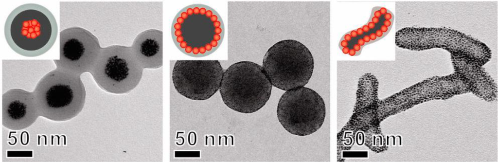 In the works presented so far, the inorganic component has been always formed ex situ and then combined, in one way or another, with the polymer or polymer particles. Strategies following this principle have the advantage of controlling the size and morphology of the inorganic nanoparticles. However, different reaction steps are required, often involving a change of solvent. The re-suspension of the inorganic nanoparticles after preparation in the solvent in which the formation of the hybrid nanoparticle occurs may not be trivial, and the aggregation and segregation become problems to overcome. Therefore, the in situ formation of the inorganic component may be in many cases an alternative to be taken into account, not only in terms of practicality but, more importantly, because it provides morphologies and size scales that would not be available by any other strategy.
