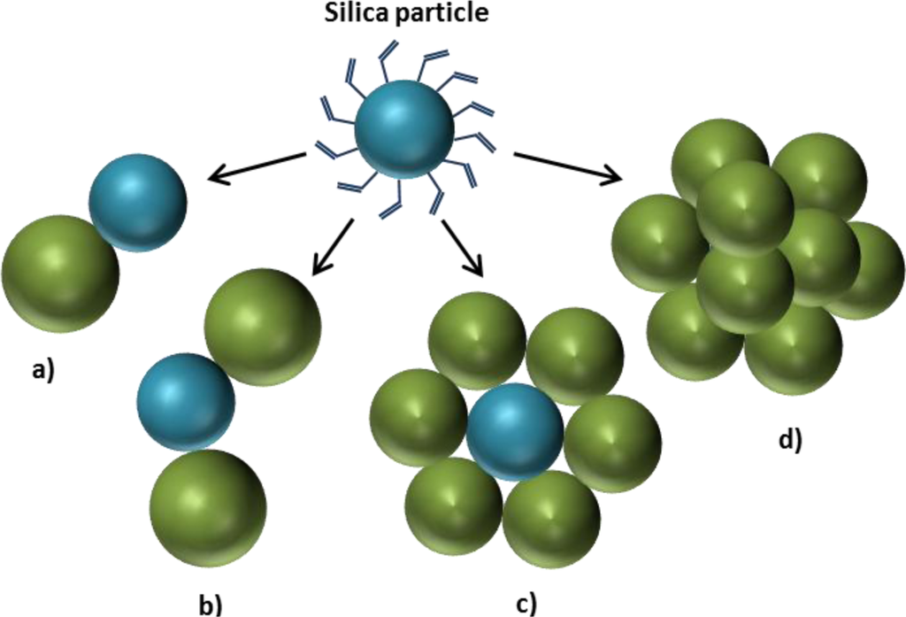 An interesting example was reported by Ravaine et al. [60,61], who were able to obtain different numbers of polystyrene nodules associated to one silica particle, accomplishing a good control of morphology. Silica nanoparticles were prepared with the Stöber process and coated with polymerizable groups from which the growth of polystyrene grains started. The ability to have a controlled number of polymeric particles on the silica surface is the most significant feature of this method. The number of polymer nodules was constant, so that different morphologies can be obtained by varying the amount of silica (Figure 8). When the ratio between silica particles and the polymer nodules was 1, a snowman-like morphology was obtained, with only one polystyrene nodule growing per silica particle. By increasing the ratio to 2, the number of nodules per silica particles was also two. At a ratio of 6, a daisy-like shape was reached. An excess of polystyrene particles gave raspberry-like morphologies.