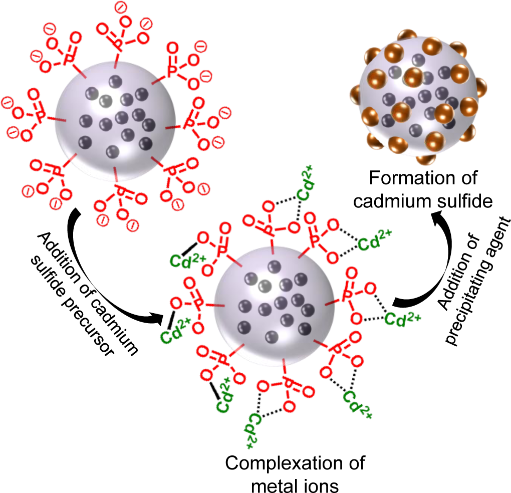 The preparation of multifunctional materials is possible by combination of in situ crystallization on the surface with the encapsulation of the inorganic components in the polymer core, described in Section 4.1. By using this method, Fischer et al. [108] reported in a recent work the synthesis of bifunctional nanoparticles containing an optically active material (CdS) on the surface and a magnetic functionality resulting from the encapsulated magnetite. The preparation of such hybrid multifunctional particles is schematically represented in Figure 9. In this work, cadmium sulfide/Fe3O4/polymer multifunctional hybrid nanoparticles were prepared by crystallizing cadmium sulfide in a controlled manner on the surface of phosphonate-functionalized polystyrene particles, which contained a magnetic core. A pre-emulsion containing styrene and a phosphonate-functionalized surface-active monomer were mixed with a second pre-emulsion containing magnetite nanoparticles capped with oleic acid. Cadmium sulfide was precipitated from the phosphonate groups on the surface of the polymer particles. The resulting hybrid particles show a “raspberry-like” structure, with superparamagnetic behavior and quantum dot fluorescence.