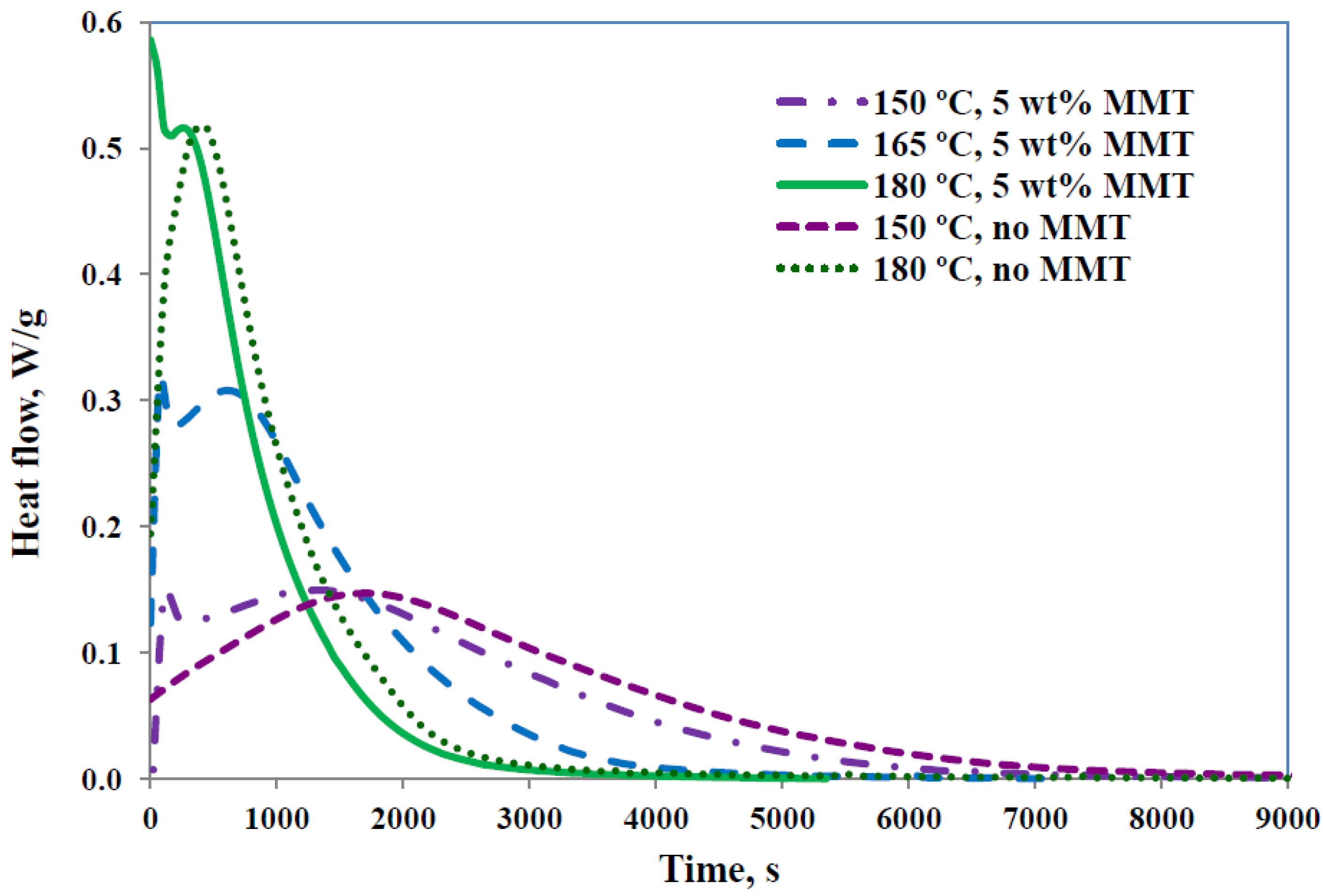 When prepared by the standard procedure described above, these nanocomposite systems using the tri-functional epoxy resin TGAP as the matrix material have previously been shown to be predisposed to exfoliate in view of the rapid intra-gallery reaction that takes place before the bulk cross-linking reaction [19,20,21]. This is illustrated in Figure 2 for TGAP/MMT/DDS samples with 5 wt% clay and cured isothermally at different temperatures, where the two overlapping reactions are clearly seen. The curing reactions for epoxy resins are complex, particularly in the presence of organically modified MMT, and have been discussed quite extensively elsewhere [17,22,25]. The several possible reactions include the reaction of the epoxide groups first with the primary amine and then with the secondary amine, and etherification catalysed by the tertiary amine and/or by the onium ion of the organically modified MMT. In the isothermal cure of the TGAP/DDS system without any clay, a single bell-shaped peak is found [26,27], shown in Figure 2 for the isothermal cure temperatures of 150 °C and 180 °C, which can be modelled as an autocatalytic reaction [20]. The rapid initial reaction that occurs in the same system with clay, TGAP/MMT/DDS, can therefore be attributed to the presence of the clay.