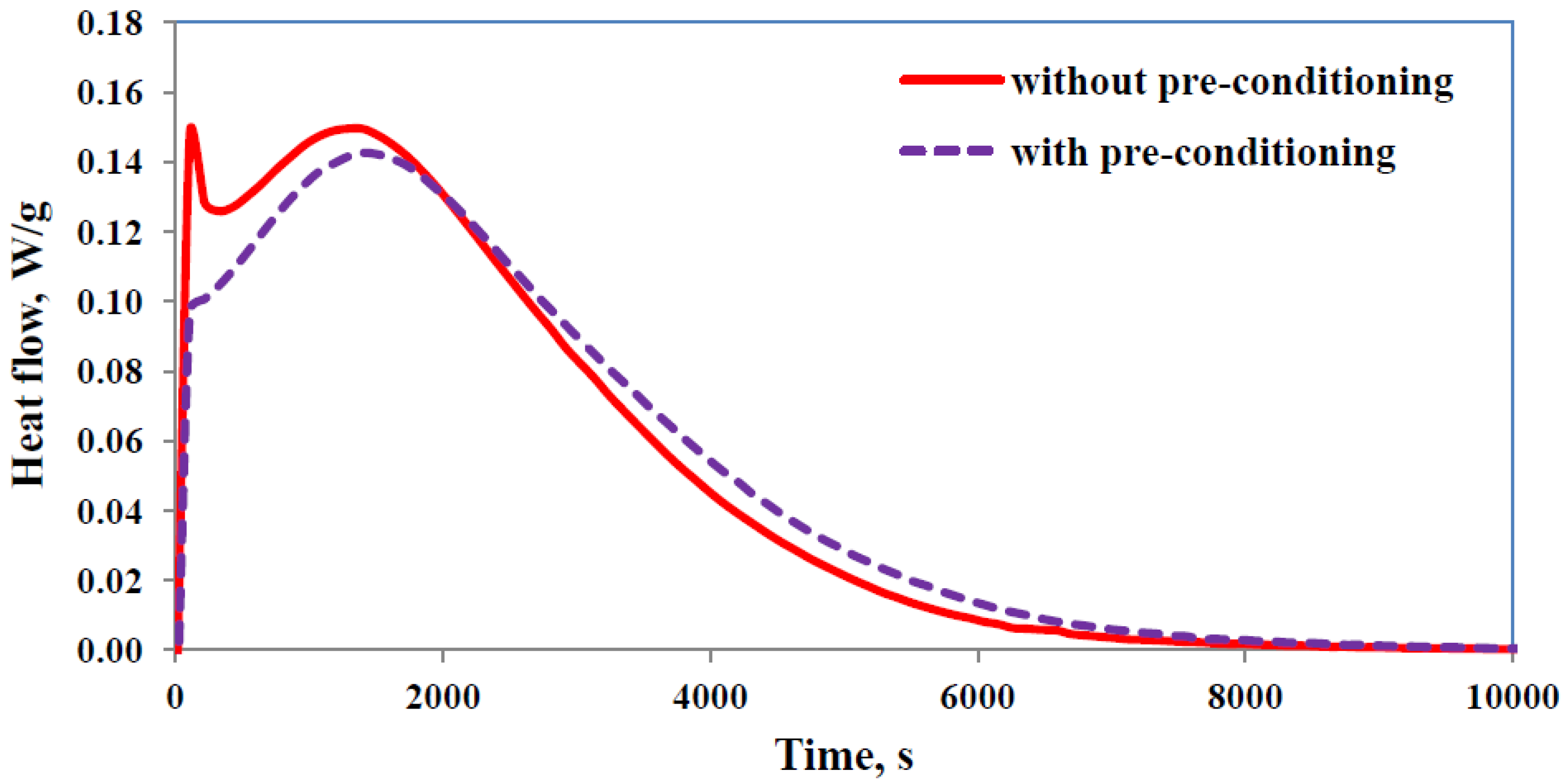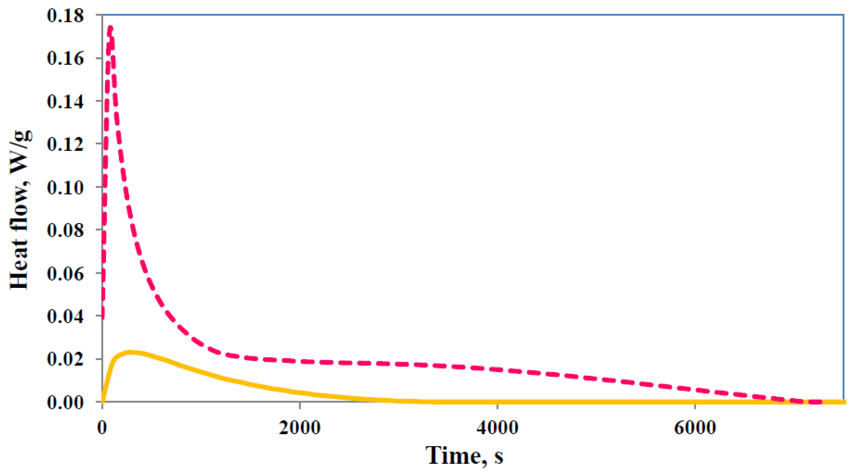 Figure 3. Comparison of isothermal cure curves at 150 °C for TGAP/MMT/DDS nanocomposites containing 5 wt% clay, with (purple curve, dashed line) and without (red curve, full line) pre-conditioning. Exothermic direction is upwards.